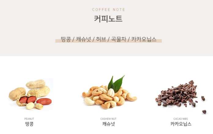 커피노트를 살펴보면 땅콩, 캐슈넛 의 견과류와 카카오닙스의 단맛도 연상됩니다.