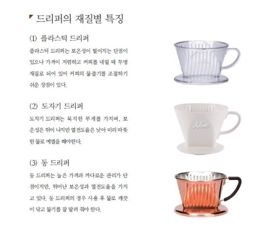 드립퍼의 재질에는 크게 금속, 도자기,천(융), 종이가 쓰이는데, 뒤로 갈수록 유분 흡수력이 강하고 미분(커피가루)의 잔여도 적어진다. 보통 종이가 가장 많이 사용되며, 뒤로 갈수록 많이 걸러진 커피가 추출되게 된다. 하지만 이것은 단점이라고 말할 수 없는 게, 개인마다 중요하게 생각하는 면이 달라서 호불호가 갈리는 부분이다. 바리스타 내에선 오히려 드립 커피의 필터가 커피오일을 잡아주면서 원두의 특성을 제대로 나타낼 수 있다고 주장하는 의견이 있다. 실제로 커피오일이 가진 `맛`이 존재하며, 미분에 의한 `맛`도 당연히 존재하는데, 이것들을 `커피 본연의 맛`으로 인정할 것인가에 따라 의견이 나뉘게 될 것이다.