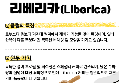 - 꽃, 잎, 열매의 크기는 아라비카나 로부스타 보다 크고 과육의 두께가 두꺼워서 가공이 어려움