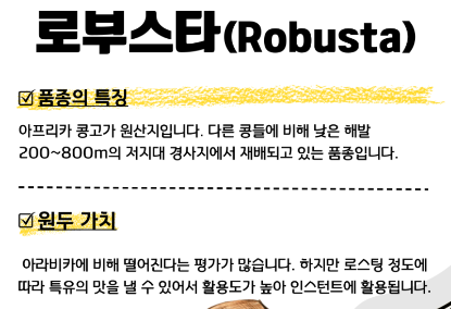 - 향이 없고 쓴맛이 강하여 향미보다는 바디감을 더하기 위해 아라비카와 블랜딩함